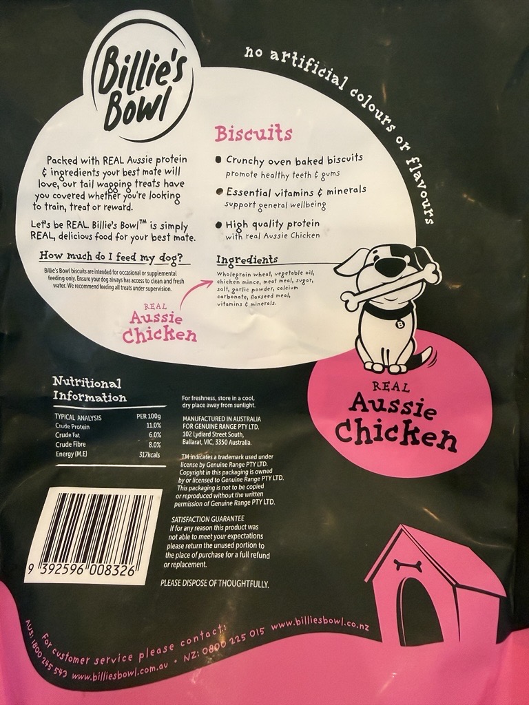 Along with all those great products above we have a little treat (biscuits from an Australian made and owned company – see below for ingredients) for your furry friends and a ball or toy to keep them busy while we are at your place finishing up the termite management system installation. The Allure Pest Solutions team all love pets, whether its cats, dogs or even horses! We couldn’t be happier to give something back to our wonderful clients.